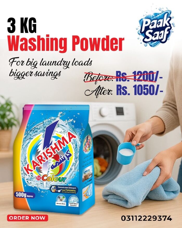 Karishma Surf Quick Wash Detergent Powder – 3 kg is designed for households that demand high-performance cleaning in every wash. With its advanced formula, it penetrates deep into fabric fibers to remove stubborn stains while maintaining the brightness and softness of your clothes.